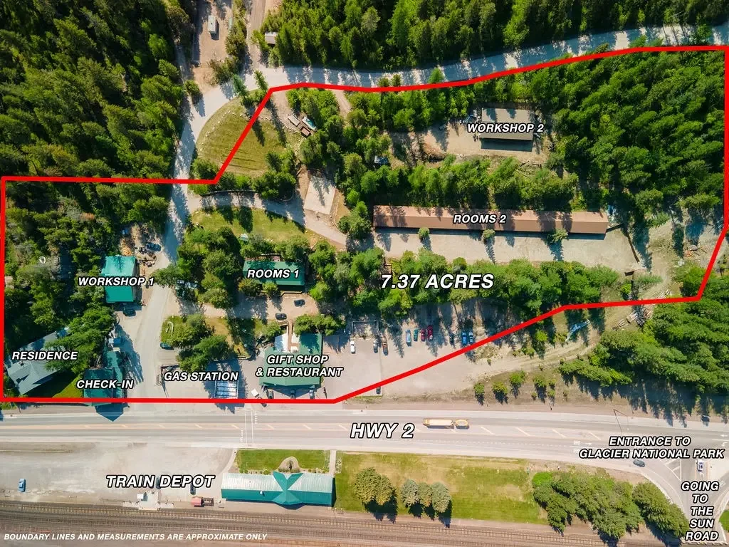 The Glacier Highland Hotel -- An incredible investment opportunity! Live in West Glacier and take over a flourishing family business that features an ideal hotel location, a restaurant (w/ beer & wine license), a gift shop with a well-known grab and go lunch area, as well as employee housing and gas station. The entire property is just over 7 acres, and it has a modern septic system and a community well already installed. Property is in no better location than across the street from the AMTRAK station and Glacier National Park's west entrance. Additionally, there is a 5-bedroom home to live on-site or use as a manager's quarters plus two workshops, one with a bonus area currently used as an owner's private gym. There is no finer place to be than this. The historic property with a rich background tied to the Great Northern Railway, has a blend of historical charm and modern amenities making it a unique and attractive space for both residential and business purposes. The extensive remodeling, including PEX plumbing and new wiring, showcases a commitment to modern convenience while preserving its historic charm. The unique layout and proximity to the business make it versatile for various purposes, such as a management setup or corporate getaways. The thoughtful additions, like programmable heated tile floors and curbless tiled showers in the main floor bathrooms, contribute to the property's luxurious and comfortable features. The primary bedroom's French doors leading to a covered deck provide a touch of elegance, and the large modern kitchen with a gas stove and copper farmhouse sink adds a contemporary flair. The dual head beer tap in the kitchen and the 12' x 8' walk-in pantry reflect attention to both entertainment and practicality. The basement, though currently unfinished, offers potential for further development or customization. The fully covered brick walkway to the parking area and the spacious 3-bay garage with large roll-up doors and plumbing details showcase a well-designed exterior. The 600 square foot multi-purpose room above the garage, currently used as a workout room, adds versatility to the property. The second story's living room with a gas fireplace and French doors leading to a covered deck create inviting and cozy spaces for relaxation.