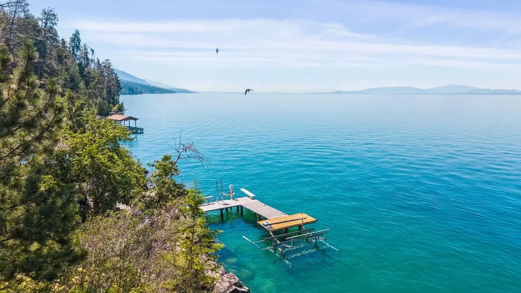 Stunning East Shore Property on Flathead Lake - 429 feet of shoreline, beach, and rock outcroppings. This waterfront property is on 2.86 acres with a stylish 4 bedroom, 3 bath home with thoughtful design details such as lots of natural light, incredible views from every room, as well as the rock you see in the interior of the home being handpicked from the property. The lower level hosts an apartment with its own entrance. The dock provides easy access to the lake, making activities such as boating, fishing and swimming relaxing and enjoyable. Above the dock is a covered grilling, outdoor kitchen/dining area providing a fantastic and pleasant space. The decks off the living rooms of the home are also set up for grilling and entertaining. Minutes away from the town of Bigfork, a lovely, year-round resort village that is brimming with art galleries, fine restaurants, Eagle Bend Golf Course, and live theatre. This property has been a successful VRBO for the last two years. Recent updates include new paint, flooring, and additional decking. A fun fact is that on some maps this property is home to the ‘Fishing Rock’ for which the road is named. This property is also an easy drive to Glacier Park, Blacktail Ski Resort, Big Mountain Ski Resort, Glacier International Airport, and many more of Flathead Valley’s amenities.
