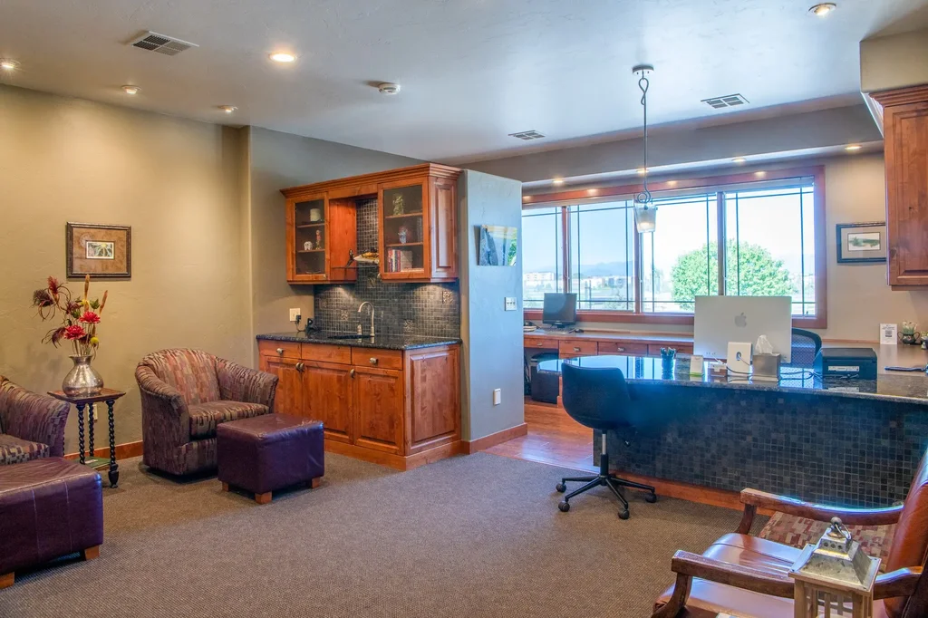 Unveil the pinnacle of professionalism with this prestigious commercial property at 40 Four Mile Drive, Suite 6, Kalispell, MT. Tailored for discerning business professionals, this upscale office condominium most recently functioned as a high-end dental office, offering a rare opportunity to own part of a coveted building seldom available for sale. Featuring elegant knotty Alder wood trim and cabinetry, granite countertops, and a blend of plush carpet, stylish laminate wood, and hospital-grade vinyl flooring, this space exudes sophistication and comfort. The office is bathed in natural light streaming through large windows, providing breathtaking views of the northern mountains, and comes complete with beautiful window treatments. Convenience is paramount with ample parking available in both the front and rear, an elevator service, public restroom, and a welcoming lobby/reception area. Customized office space includes two stations, staff kitchen, laundry hookup, and the modern comfort of heating and central air conditioning. Perfectly positioned near US Highway 93 and the Bypass, this partial building sale is an exceptional find for the business elite seeking an exclusive Four Mile Drive address. Embrace the opportunity to elevate your professional image in Kalispell's finest office condominium.