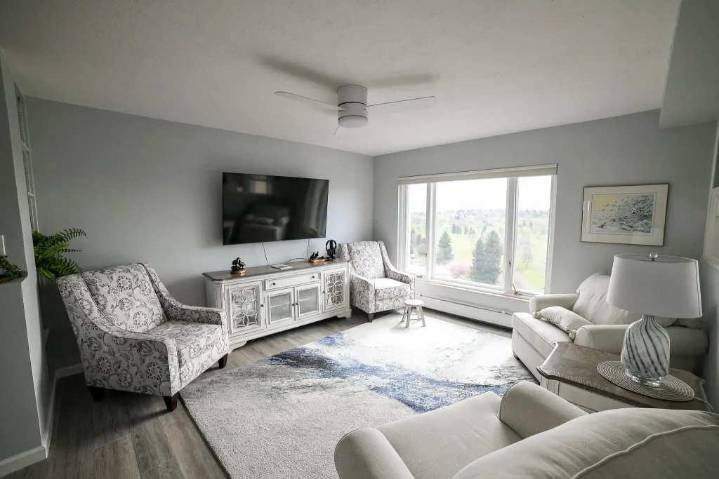 Welcome to this beautifully updated 2-bedroom, 2-bathroom condo in the desirable Country Club Towers. Offering 1,700 sq ft of spacious, light-filled living, this fully furnished unit boasts modern decor, a stylish kitchen perfect for entertaining, and a bright living/dining area with breathtaking views of Meadowlark Golf Course. A versatile den provides the option for a third bedroom or home office. The included newer washer and dryer add convenience, while the thoughtfully curated furnishings make this home move-in ready. Building amenities include a ground-level common area with picnic table and large grassy space. The 11th-floor shared room with panoramic views of Great Falls and nearby mountain ranges, ideal for meetings or gatherings There is assigned underground parking space and guest parking lot. No pets or rentals allowed per building By-Laws.
