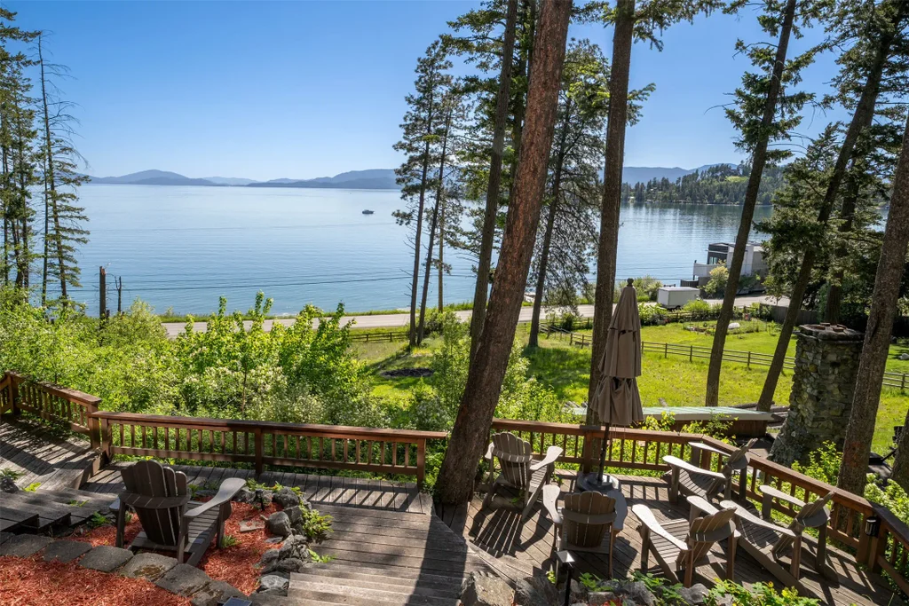 Expansive 5-bed, 4-bath, 3976 SF rustic modern Montana home on 14 acres with 124' of Flathead Lake frontage, perfect for your Montana dreams of lake and land recreation ... swim, hike, fish, or ride horses from your property up into the public lands beyond from this unique and very rare property, you can do it all! The main upper level features a primary suite, chef’s kitchen, great room, guest bedroom, and expansive decks with stunning lake views and sunsets. The lower level shares the spectacular views and offers separate living quarters with a private entrance and patio, primary suite, two additional bedrooms, kitchen, and laundry, and is also accessible via the circular staircase from above. Bordering State Lands with National Forest beyond, you will enjoy trails to lakes, fishing, and huckleberries. Located south of Bigfork in vibrant Woods Bay, you're just steps from restaurants and live music entertainment. Proven rental income from both levels. A county permit may be required. The property spans two parcels with diverse landscapes. The upper parcel’s flat to rolling benches, were previously used for horse grazing, and includes an incomplete foundation from a prior owner’s project, offering potential for gardening, horses, or other projects with lake views, very usable topography and unique rock outcroppings. The lower parcel features a versatile barn/shop and a historic stone fireplace from the old stone homestead, now a charming outdoor fire gathering place. Bordered by State Lands with National Forest beyond, the estate provides unparalleled access to outdoor recreation, including hiking, fishing, and lake activities. The home’s design blends rustic elegance with modern amenities, showcasing high-end finishes and panoramic Flathead Lake vistas. Ideal for multi-generational living or investment, the two separate level's quarters have a strong rental history. Woods Bay’s lively scene, with dining and entertainment nearby, enhances this rare lakefront retreat’s appeal. Build the dock of your dreams to further enhance your enjoyment of the magnificent Flathead Lake! Note there is a wood fireplace on the main level in the great room, a gas stove in the entry, and a gas fireplace in the primary suite on the main level. There's also a gas fireplace in the great room on the lower level. There is a barn below the house and an old foundation above the home on the upper parcel.