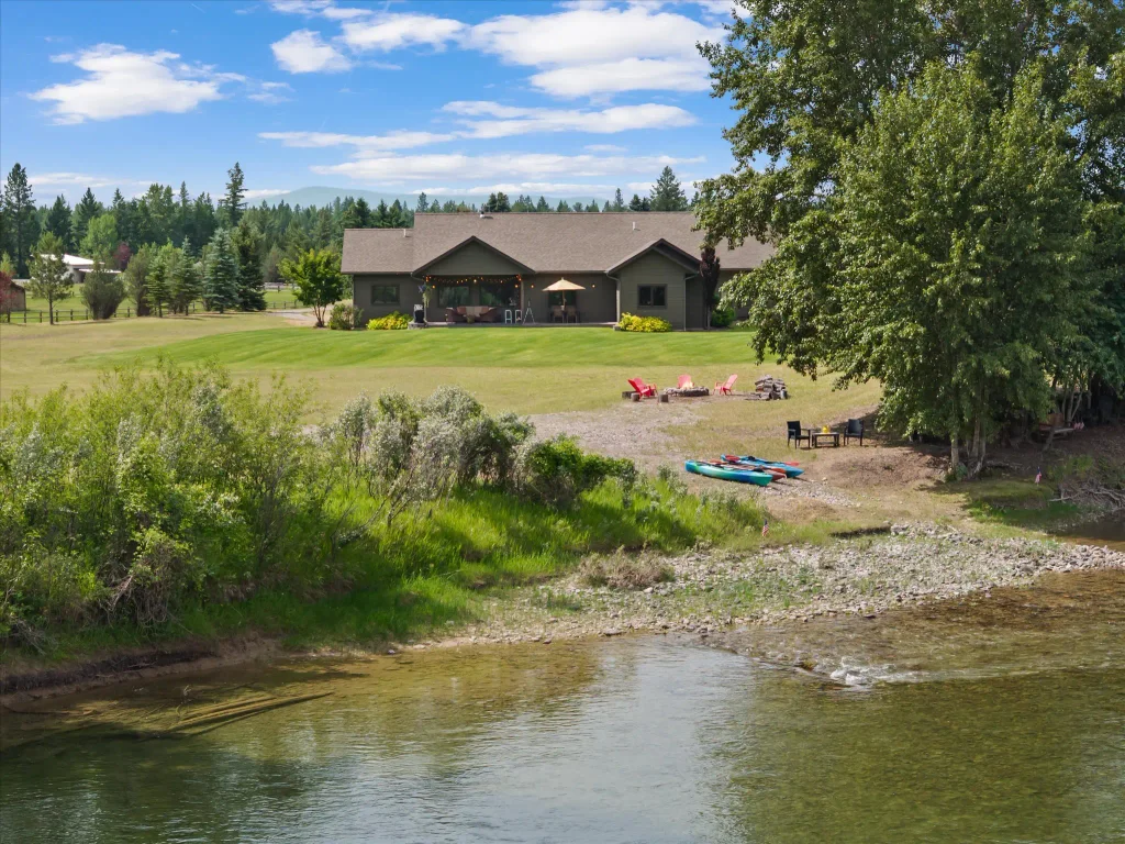 Embrace a rare gem on the banks of the Flathead River with 8.49 acres of over 850 feet of accessible river frontage, inviting you to fish, paddle, or simply soak in the tranquil Northwest Montana ambiance. This home captures the essence of its surroundings with panoramic views of the surrounding mountains, meadows, and water through generous windows, complementing an open floor plan with vaulted ceilings and an inviting gas fireplace. The kitchen, designed for gatherings, flows seamlessly into the living and dining areas, while three well-appointed bedrooms, a spacious den, and nine-foot ceilings offer comfort and versatility. Outside, a private orchard, ample parking, an oversized heated garage, and a generator enhance the property’s appeal. Zoned SAG-10 with no HOA and permitted for short-term rental, this income producing retreat offers endless potential for personal enjoyment or as a strategic investment, all just moments from local amenities and outdoor adventures. - Propane gas grill hookup - Retractable shade on back deck - generator 40 day fuel capacity - Short-term Conditional Use Permit in place - Furnishings negotiable - Full RV hookup - Irrigated Orchard - 1 year home warranty - $50k seller credit for updates OR rate buy-down