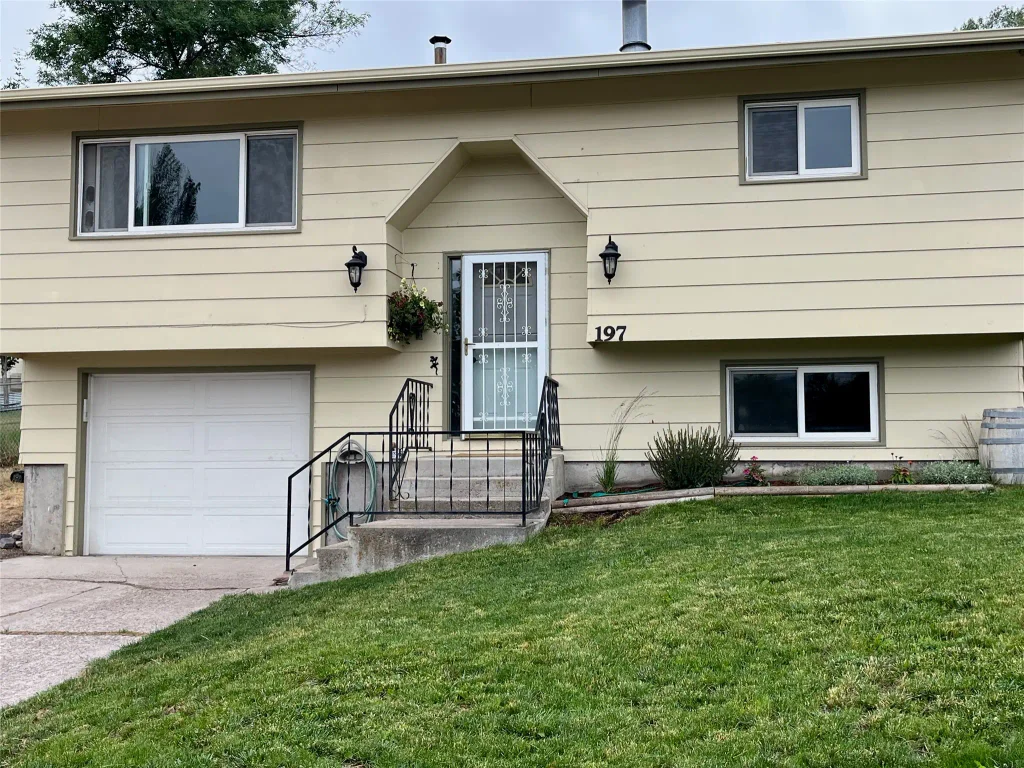 Welcome home to this cute and clean home on the hill in Lolo. Close to shopping, dining and a local pickle ball/ tennis/ basketball court, plus easy access to Missoula, 197 Ridgeway is ready for its new owner. Split level living allows for a open concept feel with a living room that is large and filled with daylight from the picture windows that also provide views of the Sapphire mountains. The kitchen has newly painted cabinets, newer refrigerator and dishwasher and adjacent breakfast nook. There are 2 upper level bedrooms and 1 full bathroom boasting a tile surround bathtub and shower and tile floors. The lower level has a 3rd bedroom room, den with a gas stove remodeled 3/4 bath with another tiled shower, laundry room and access to the attached, heated and extra long tuck under garage. The backyard is fenced, hosts several different types of fruit trees and the lot is large at 9,147 sq. ft. If the house does not provide enough space there is more room to be utilized in the insulated and finished 12x24 shed. The uses for this bonus space are endless. Updates to the home include a new roof in 2024, fresh paint and new carpet in the lower level. The property is in the Lolo water district which means there is not a water meter or monthly water bill.