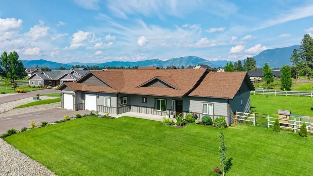 Tucked within the quiet, paved streets of Country Home Estates, this newer ranch-style home blends the comfort of modern construction with the natural beauty of Montana’s landscape. Built in 2021, this 2,382 sq ft single-level residence sits on over half an acre and showcases panoramic views of the northern and eastern mountain ranges. Inside, you'll find four spacious bedrooms, three bathrooms—including a powder room for guests—and a light-filled great room with soaring vaulted ceilings. The open layout is designed for effortless everyday living and relaxed entertaining. A well-equipped kitchen, cozy dining nook, and seamless flow to the outdoor patio all enhance the home’s appeal. The backyard is fully fenced and immaculately maintained, offering both privacy and the perfect vantage point to take in Montana’s changing skies. With central air conditioning, a heat pump, underground sprinklers, and an attached two-car garage, this home was designed with both comfort and... functionality in mind. Located just minutes from Whitefish, Columbia Falls, and Glacier National Park, this property combines peaceful rural living with easy access to the best of the Flathead Valley. Property has 500 gallon buried propane tank.