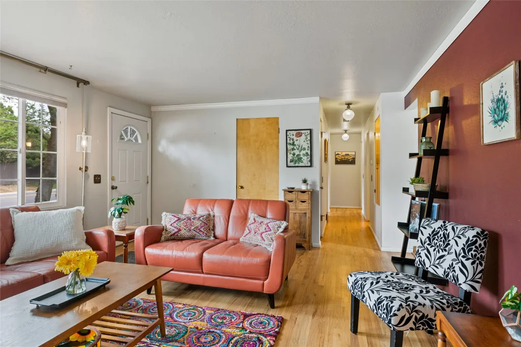This 4-bedroom, 2.5-bath home offers flexible living across two levels. The main floor centers around hardwood floors and a gas fireplace with mid-century modern character, leading into a spacious kitchen with breakfast bar and dining area. The primary bedroom has a private half bath, while two additional bedrooms and a full bathroom serve the main level. Convenient main-floor laundry makes everyday living easier, and the attached garage includes built-in shelving for storage. Outside, a large fenced backyard features underground sprinklers and a storage shed. The lower level adds significant space with a second living room and gas fireplace, an egress window for natural light, a fourth bedroom, and a bonus room with potential for a 5th bedroom or home office. You'll also find an additional bathroom and large storage room downstairs. New roof and furnace mean you can move right in without worrying about major systems.