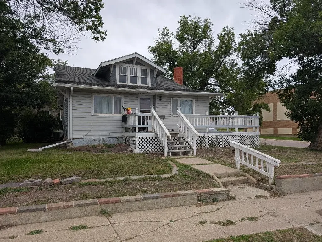 This is an "older-style" home with a large wrap-around front deck. The interior was painted, updated, and carpeted in 2018. Furnace has been updated, and the water heater was recently replaced. The front bedroom has room for a sitting area as well as the bed and furnishings. The fireplace in the living room has not been used for several years as the property has been a rental for the past 7 years. The bathroom has a large shower, but no tub. The laundry is located on the main floor. Basement area has been used just for storage and furnace area. There is some settling evident in the basement. The exterior of the home has vinyl siding, and some of the windows have been replaced. There is an attic area but can only be accessed from the outside. The detached garage has a metal roof with the main house roof consisting of shingles. There is some peeling paint on the outside and deck. The home sits on a corner lot and has a landscaped yard. Sidewalks, brick patio, and central air.