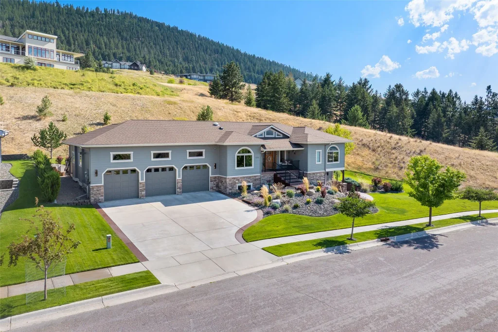 Step inside this 4-bedroom, 3-bathroom home to an open floor plan featuring circular-sawn hardwood floors, a great layout, entertaining space inside and out and too many amenities to list. This home is surrounded by HOA open space, protecting your privacy and views. The three-car garage is a showstopper! The living room features a custom fireplace, while the breakfast nook frames breathtaking views of Missoula and the mountains. The kitchen is designed for both style and function with granite countertops, abundant cabinetry and workspace, a copper sink, and a high-end Miele induction steam oven. A large dining room completes this open floor plan. Walk through the spacious laundry room/pantry, which adds exceptional convenience, to the unbelievable 3-car garage with soaring 18' ceilings, a workbench area, storage, and a custom drop zone. The main-level primary suite includes a private balcony overlooking protected HOA open space, a large walk-in closet, and a spa-like bathroom. Another bedroom and full bathroom finish the main floor. The lower level, with radiant heated floors, expands the living space with a second living room, office nook, a hobby room, two additional bedrooms, and a walk-out patio. The six-channel sound system extends to the back yard patios, primary suite deck & bath, front porch, breakfast nook and garage, creating the ideal setting for entertaining or relaxing. This home has custom landscaping and multiple, perfect outdoor spaces. The design of the home on the lot, with the surrounding HOA open areas provide privacy and beautiful views. This property combines luxury finishes, a smart layout, and incredible amenities—all just a ¼ mile up the road from the Sousa Trailhead, connecting you to the Mount Dean Stone Trail Project!