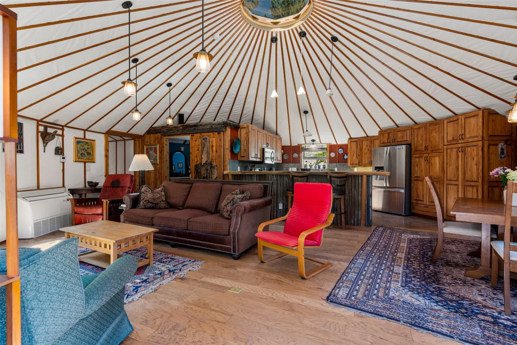 Year-Round Living in a Unique Yurt Retreat on 4.2 Forested Acres – Just 15 Minutes from Missoula! Enjoy the best of Montana living in this one-of-a-kind yurt home, fully permitted with a certificate of occupancy and designed for comfortable year-round use. Nestled on 4.2 acres of serene, forested land—complete with a Stewardship Forestry certification from Montana- and no covenants to restrict your vision. Inside, the home is warm and inviting with beautiful hickory floors throughout and soaring ceilings that fill every room with natural light. The custom kitchen features a slate backsplash, tile counters, marmoleum floors, and stainless steel appliances—including a French door refrigerator, range, and dishwasher. The flexible floor plan is currently configured as two bedrooms plus an office, a lofted yoga/reading nook, and two full baths, with a three-bedroom septic system in place for future options. Wake up every morning looking at the sky through the incredible skylight! Each of the three yurts has its own large skylight. Thoughtful amenities include a mudroom, laundry room, radiant floor heating, on-demand hot water, and brand-new (2024) mini splits in each yurt for supplemental heating and cooling. The property is designed for both everyday living and recreation. A covered carport includes attic storage, while the expansive driveway provides space for RVs, campers, snowmobiles, or other toys. This property also offers direct access to recreation with Forest Service land only a quarter mile away, providing opportunities for hiking, biking, cross-country skiing, and snowmobiling. Step outside to enjoy a peaceful patio surrounded by mature trees—truly the epitome of living with nature. With year-round access, a private well, standard electric connection, and the comfort of a home that’s been lived in year-round by the current owners, this unique retreat offers both convenience and seclusion just minutes from Missoula. Don’t miss the walkthrough video! Financing option available through Stockman Bank based on my research.