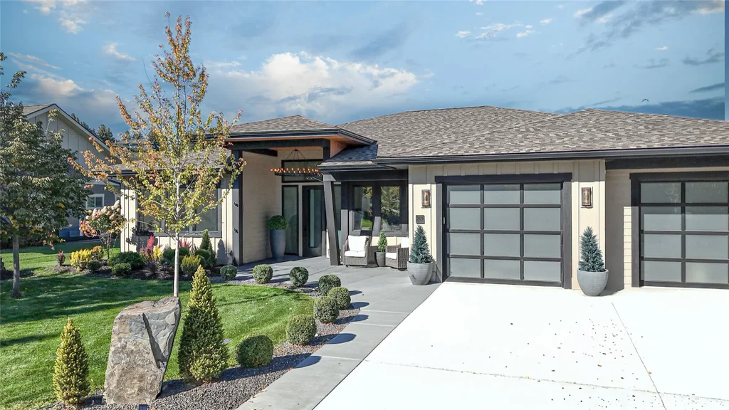 Located on the 13th hole of Village Greens Golf Course, this custom-built 2022 home combines thoughtful design with low-maintenance luxury. The single-level, 2,207 sq ft layout is ADA-compliant and filled with natural light from large windows overlooking the fairway. Finishes include custom cabinetry, quartz countertops, and elegant chandeliers in the main living areas. The open-concept floor plan connects the kitchen, dining, and living spaces, creating an inviting flow for entertaining or relaxing at home. The primary suite features a walk-in tile shower, double vanity, and generous storage, while two additional bedrooms and a separate office or den provide flexibility for guests or work. Outside, low-maintenance water features complement the landscaped yard and covered patio, offering a peaceful place to unwind. A finished double-car garage completes the package. Just minutes from downtown Kalispell, Logan Health Medical Center, shopping, and 30 minutes from Glacier National Park.